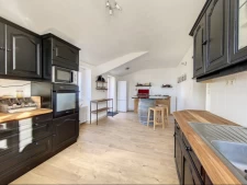L’entrée ouvre sur une cuisine ouverte, aménagée et équipée. Dans sa continuité, le palier dessert d’un côté l’escalier permettant d’accéder à l’étage, de l’autre un spacieux séjour de 30m2 dont le poêle à bois et le parquet apportent chaleur et charme.